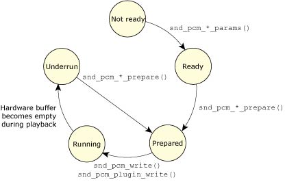 The only ways to move out of this state are to close the subchannel or to reprepare the channel as you did before (see "Preparing the PCM subchannel," earlier in this chapter). This forces the application to recognize and take action to get out of the underrun state; this is primarily for applications that want to synchronize audio with something else. Consider the difficulties involved with synchronization if the subchannel simply moves back to the SND_PCM_STATUS_RUNNING state from underrun when more data becomes available.