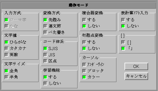 VJE has various mode options. You can set these options in the mode options panel. To open the mode options panel, click on the Mode Status Button of the VJE Toolbar and select オプション (Options). The mode options panel looks like this: